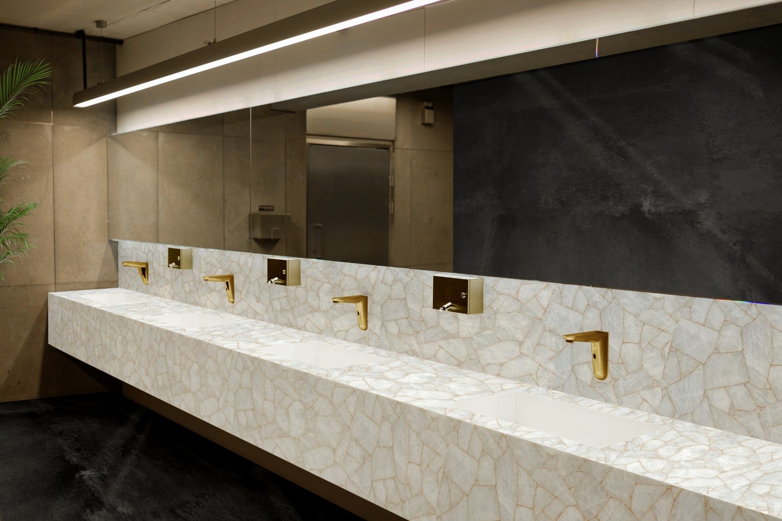 White quartz with gold leafing is a surface that exudes quiet opulence and refined artistry. The base material—pure white quartz—offers a luminous clarity and subtle crystalline texture, creating a serene canvas that feels both grounded and ethereal.