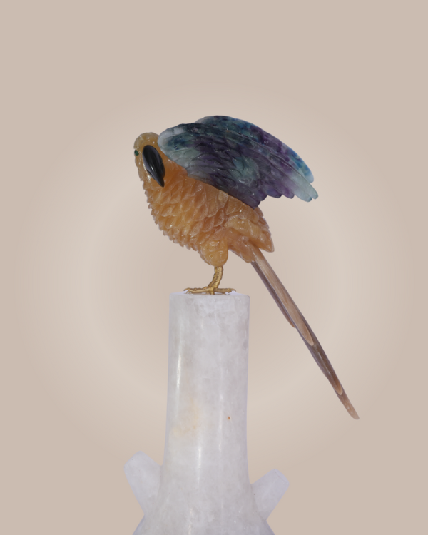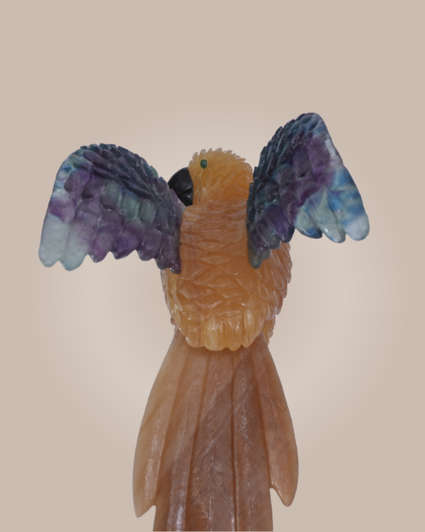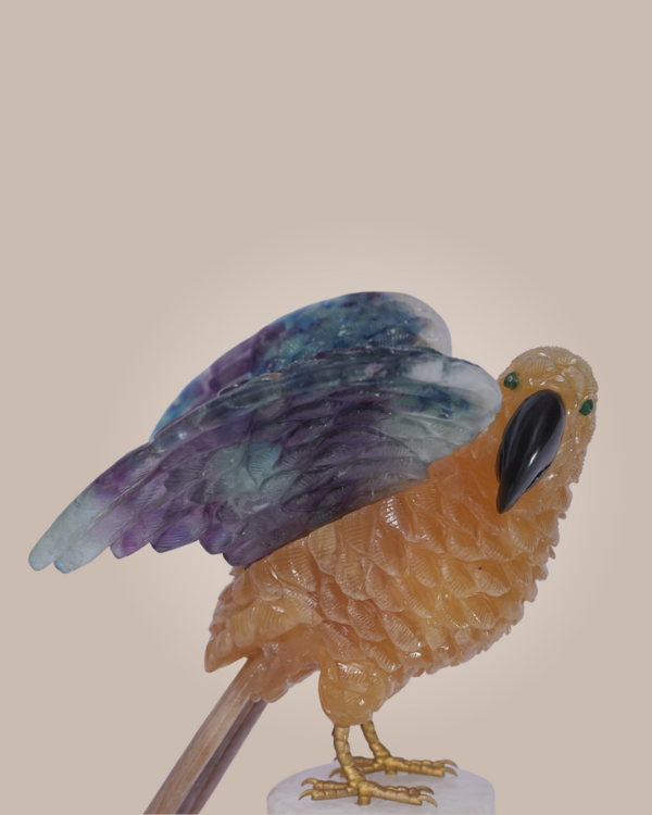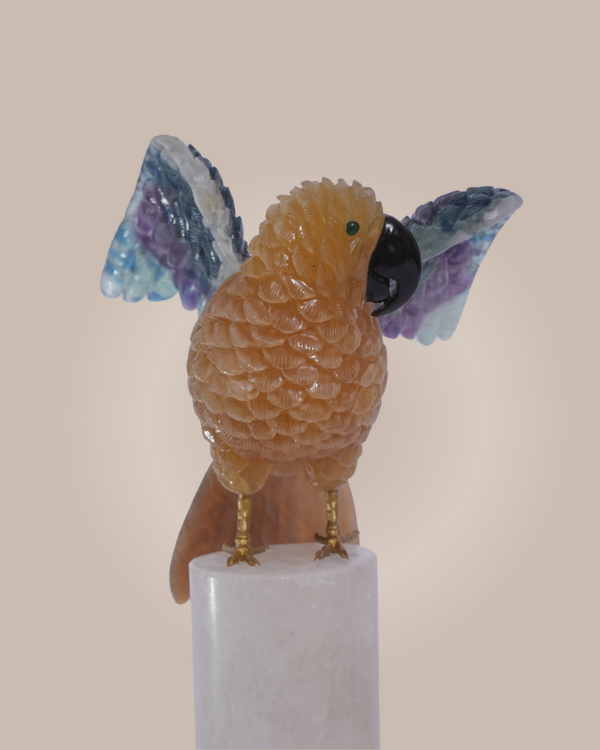 A majestic hand-carved parrot crafted fromradiant yellow calcite and multi-colored fluorite, celebrating vibrant artistry and nature’s elegance. Celestial Plumage is a breathtaking sculpture that captures the grace and vibrancy of a parrot in flight. Expertly hand carved from yellow calcite and multi fluorite, this piece stands 11 inches tall with a body width of 4 inches, while each wing extends 5 inches in length and 4 inches in width, creating a dynamic and lifelike silhouette. The luminous yellow calcite forms the parrot’s body, radiating warmth and vitality, while the wings crafted from multi fluorite—display a mesmerizing blend of greens, purples, and blues. Perched on a pristine white base, the sculpture evokes movement and freedom, making it a striking centerpiece for refined interiors or curated collections. More than a decorative object, Celestial Plumage is a celebration of craftsmanship and natural beauty, inviting admiration and serenity into any space. Its harmonious blend of materials and meticulous detailing reflect the spirit of Sawai Homes—where artistry meets soul.