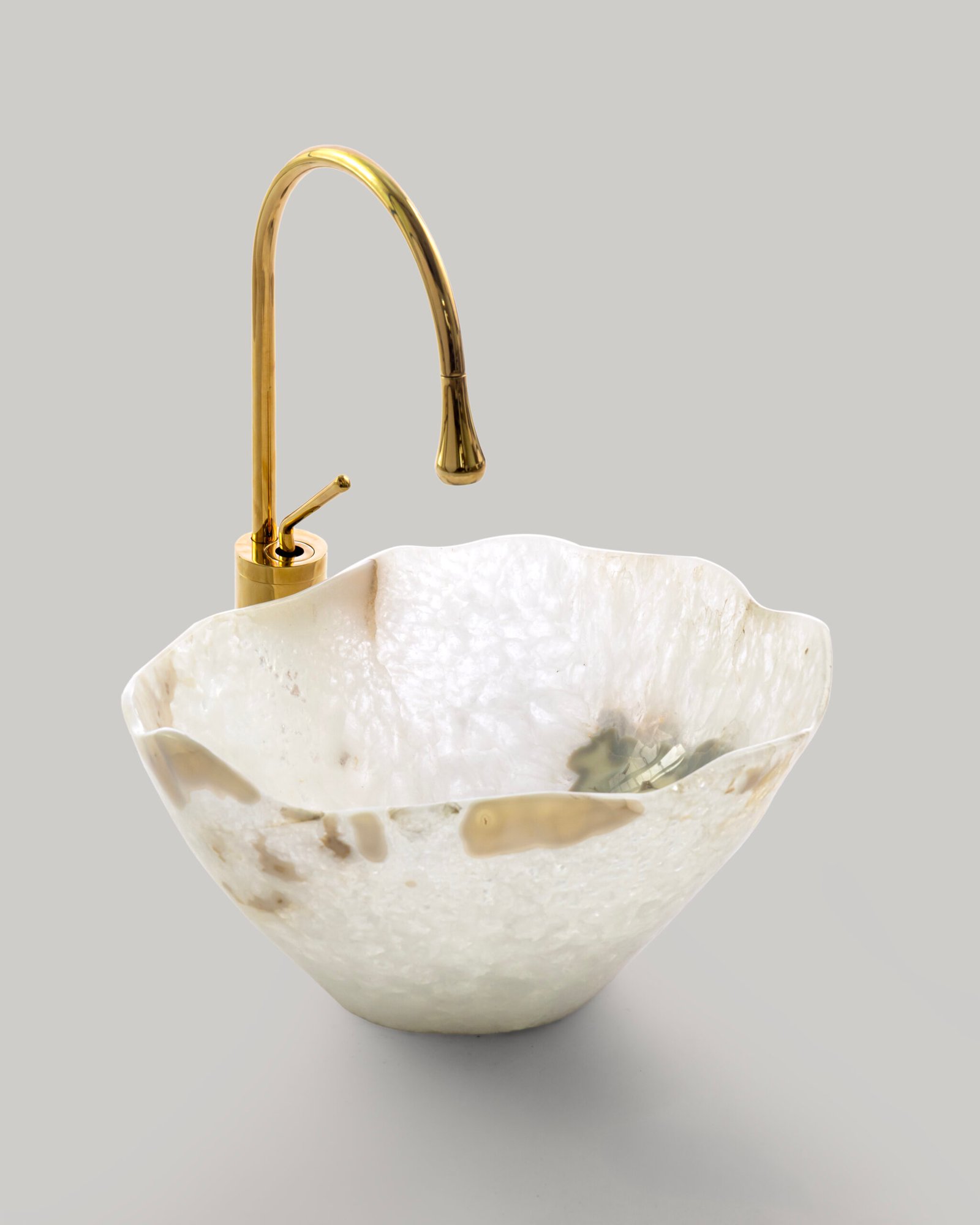 Hand-carved from luminous white agate, the Moon Whisper basin captures the ethereal elegance of moonlight on still water. Its gentle translucence and soft veining make it a serene centerpiece, radiating calm and refined beauty. Accented with a golden faucet, it’s a perfect harmony of luxury and tranquility.